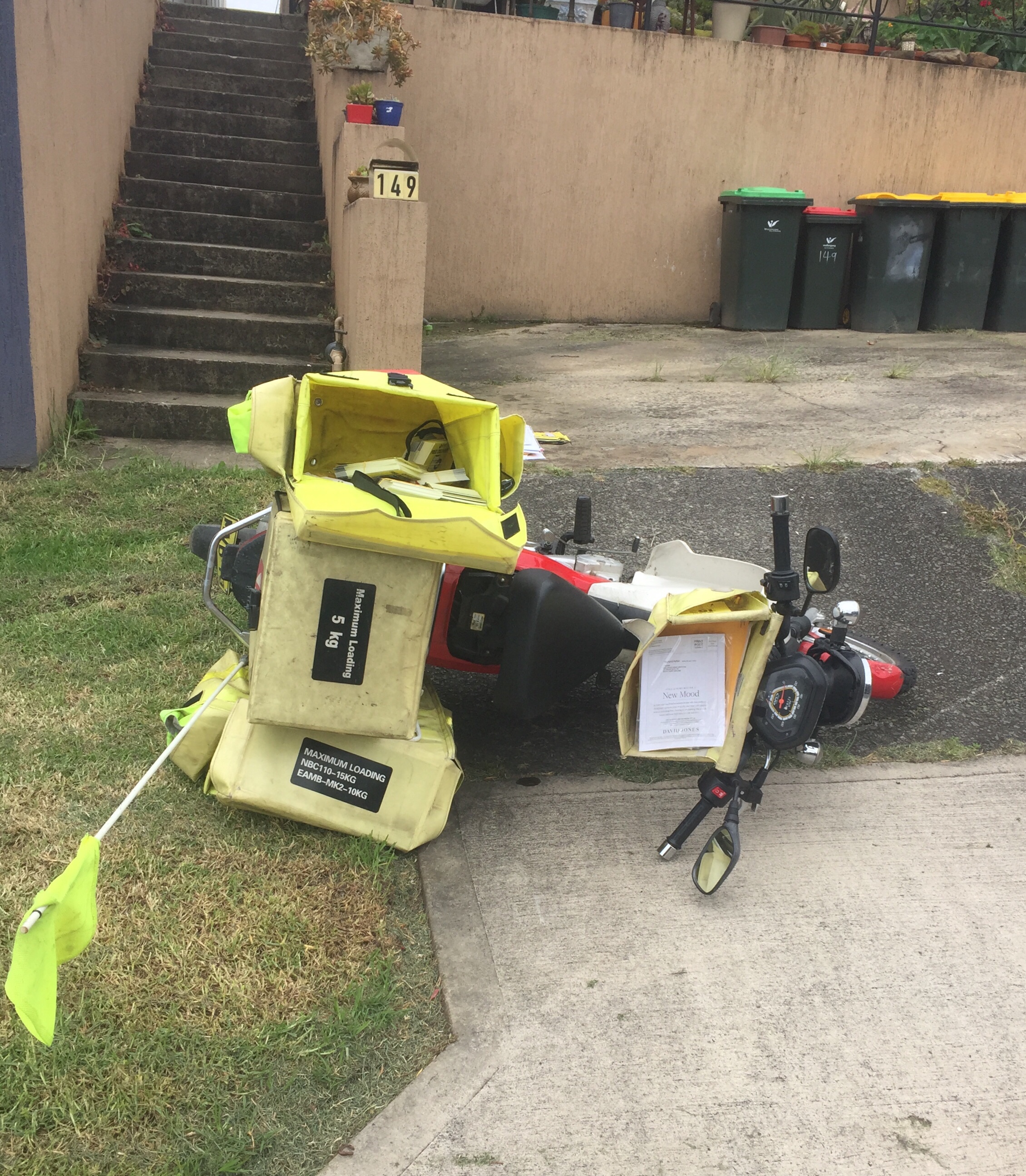 This is what happened: Its been a year since I was placed on the books of Australian Literary Management so On the anniversary of this significant event, I decided to contact my agent Lyn and report on the progress of my crime-novel-in-the-works, Burned. I emailed the opening 50 pages and she likes it! I’ve now passed the 60,000 word mark (the complete manuscript will run 75,000-80,000 words). I’ve just returned to my postie run after a week off and told my bike these pieces of news today. The picture above is its reaction. Shock. Surprise. Who knows?